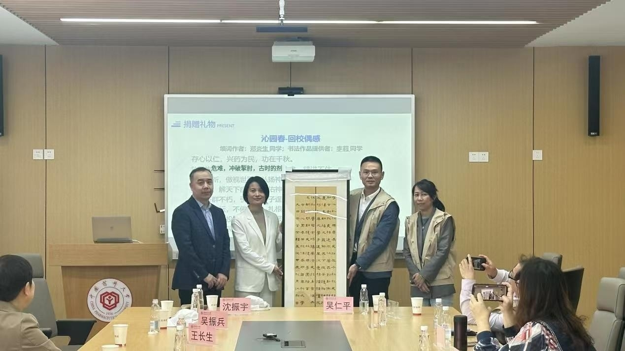 接下来,1994级医药企业管理专业的员工代表向william威廉中文官网捐赠了诗词书法作品,表达了全体员工对母校和william威廉中文官网深深的敬意和衷心的祝福。员工们表示将继续践行“精业济群”的校训精神,为医药事业、为社会发展增光添彩。