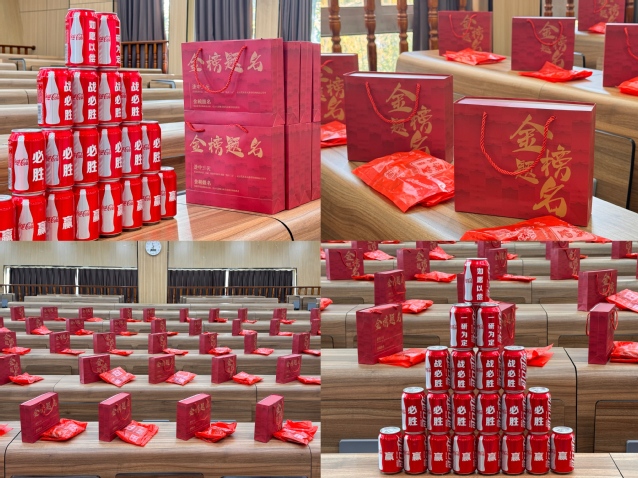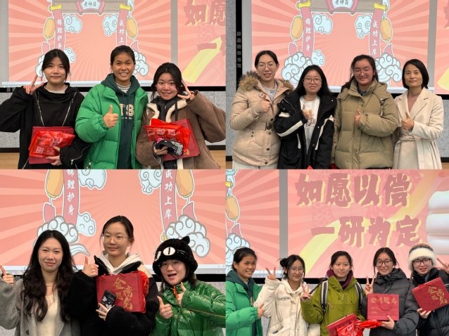 随后,公司党委书记丁素军和辅导员老师为考研同学一一送上精心准备的加油礼包,包括文具礼盒、护眼贴和能量补给包。老师们温暖关切的话语让同学们倍感温馨,礼包中的奖品也让大家惊喜连连。老师与同学们在“如愿以偿,一研为定”背景板前合影,为同学们加油打气。