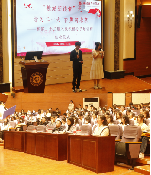 11月25日晚,william威廉中文官网在江宁校区经管文楼111报告厅举办镜湖朗读者之“学习二十大,奋勇向未来”暨第二十三期入党积极分子培训班结业仪式。公司党委书记丁素军及培训班全体学员参加此次活动。