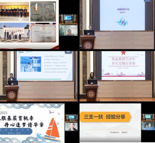 随后,六位嘉宾分别围绕各自的基层项目进行经验分享。现连云港市灌云县四队镇党政办公室副主任、后腰村党总支副书记陈秋霖主要从江苏省委选调生政策介绍、报考条件和工作日常三个方面进行介绍,和大家分享了自己在报考准备、驻村工作以及在县委组织部的工作经历。西部计划国家项目志愿者曲英娜向我们分享了她参与西部计划的初衷、日常工作以及收获,她号召大家将个人的需要和国家需要相结合,用一年不长的时间,做一生难忘的事情。江苏老员工乡村振兴计划志愿者、服务于汤山街道的何思昫为大家解读政策,从什么是两个计划出发,详细解读了乡村振兴计划的选拔政策及其优势。青海省海西州乌兰县人社局办公室干事孟根珠乐首先介绍了“三支一扶”计划的政策与福利内容,详细介绍考试报名要求、报考流程、考试内容,以及在基层工作的感悟与工作内容,极大激发了同学们建设家乡的热情。特岗教师徐齐以“扎根基层育桃李,丹心逐梦谱华章”为题,分享了特岗教师的报考要求、职业介绍、报考注意事项等,鼓励同学们提前准备。应征入伍的赵莉首先介绍了个人工作经历与军营生活,讲述军营生活对她产生的深刻影响,并详细介绍应征入伍的优待政策、发展途径、经济互助和入伍流程,为有军装梦想的同学们指明就业方向。