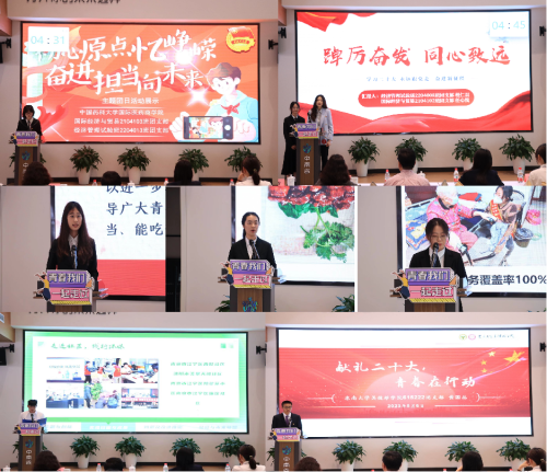 展示过程中,我校国际医药商学院5支队伍分别以《继坚韧不拔之勇 创笃行不怠之功》《信仰点亮青春 笃行成就梦想》《青春向党沐风雨 杨帆追梦砥砺行》《初心原点忆峥嵘 担当奋进向未来》《踔厉奋发 同心致远》为题进行展示,东南大学吴健雄公司以《献礼二十大,青春在行动》为题、南京航空航天大学计算机科学与技术公司以《垃圾+创意=宝藏”改造计划》为题、河海大学大禹公司以《少年奋进无遗力,继往开来义不辞》为题进行分享。各支部立足青年视角,以微团课、手绘长卷、实践服务、视频创作、情景剧演绎、参观红色教育基地等丰富多彩的形式,生动阐述了新时代青年要发扬“功成不必在我、功成必定有我”的责任感和使命感,践行“请党放心,强国有我”的铮铮誓言和行动自觉,现场气氛热烈、掌声不断。