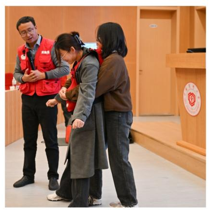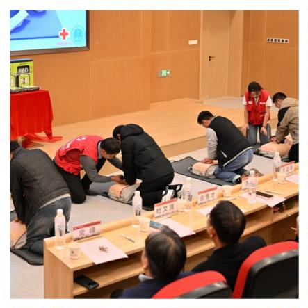 捐赠仪式结束后,还开展应急救护培训活动。南京市红会CPRAED课程主任讲师、美国心脏协会南京海金娜心血管急救培训中心主任余集才为师生开展应急救护培训。培训上,余集才主任通过“知识讲解+现场演示+实操体验”授课方式,就心肺复苏、AED使用、海姆利克急救法等应急救护知识和技能为现场师生进行生动详细讲解和演示,指导师生操作演练,帮助巩固操作要领。在急救技能实操练习环节,公司师生积极上台使用假人模型与AED学习急救方法,跟着余集才主任学习急救技能。