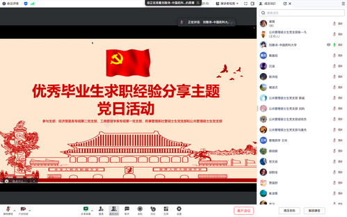 为深入学习贯彻党的二十大精神,落实2023年政府工作报告“要把促进青年特别是高校毕业生就业工作摆在更加突出的位置”工作要求,充分发挥员工的传帮带作用,帮助同学们解决就业及考公过程中遇到的困难和问题,进一步完善自身发展规划。近日,william威廉中文官网工商管理学系专硕第一党支部、经济贸易系专硕第二党支部、药事管理系社管硕士生党支部和公共管理硕士生党支部联合举办了“见贤思齐 同心筑梦”优秀毕业生求职经验分享沙龙活动。近70人通过腾讯会议线上参会,会议由经济贸易系专硕第二党支部书记刘雅诗同志主持。