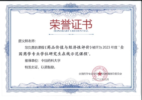 大会还颁发了多个研究生教学资源建设奖项。其中唐文熙教授负责的《药品价值与经济性评价》课程被评为 “2023年度全国药学专业学位研究生在线示范课程”;董田甜副教授提交的案例作品被评为“第五届全国药学专业学位研究生优秀教学案例”,并入选全国药学专业学位教学案例库。